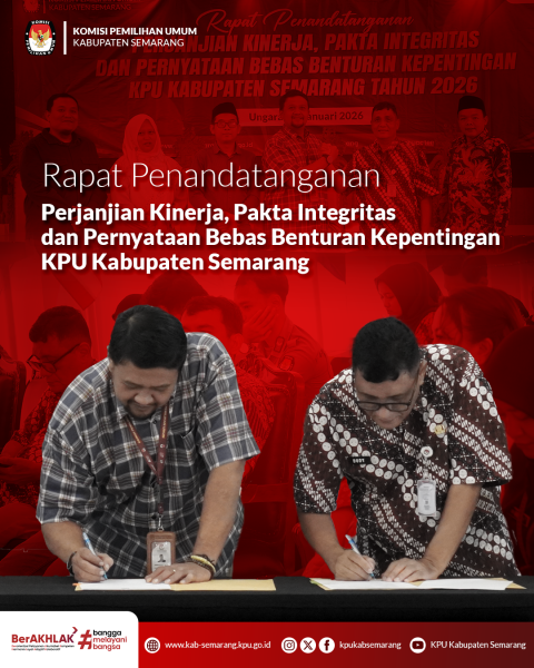 Ungaran - Sebagai langkah awal memasuki Tahun 2026, KPU Kabupaten Semarang menyelenggarakan kegiatan Penandatanganan Perjanjian Kinerja, Pakta Integritas, serta Pernyataan Bebas Benturan Kepentingan pada Jumat (09/01/2026). Kegiatan ini menjadi wujud komitmen bersama seluruh jajaran dalam menjalankan tugas secara profesional, transparan, akuntabel, dan berlandaskan integritas. Penandatanganan tersebut diikuti oleh Ketua dan Anggota KPU Kabupaten Semarang bersama jajaran sekretariat, sekaligus menandai dimulainya pelaksanaan program dan kegiatan kelembagaan Tahun 2026. Momentum ini juga mempertegas sikap dan komitmen KPU Kabupaten Semarang dalam menjunjung tinggi nilai kejujuran, netralitas, serta tanggung jawab sebagai penyelenggara Pemilu dan Pemilihan. Dalam arahannya, Ketua KPU Kabupaten Semarang menegaskan bahwa integritas merupakan fondasi utama dalam setiap pelaksanaan tugas. Seluruh jajaran diharapkan mampu bekerja dengan penuh keikhlasan, memegang teguh komitmen yang telah ditandatangani, serta menjauhi segala bentuk perbuatan yang dapat mencederai marwah lembaga. Ketua KPU Kabupaten Semarang juga mengingatkan pentingnya menjaga kebersamaan dan soliditas internal. Ia menggambarkan KPU sebagai satu kesatuan yang saling terhubung, di mana setiap unsur memiliki peran penting dan harus saling menguatkan. Oleh karena itu, kerja sama, rasa persaudaraan, dan semangat kolektif menjadi kunci dalam menciptakan lingkungan kerja yang harmonis. Melalui kegiatan ini, KPU Kabupaten Semarang berkomitmen untuk terus bergandeng tangan, menjalankan tugas dengan semangat dan penuh kegembiraan, serta menjaga independensi dan integritas demi terwujudnya penyelenggaraan Pemilu dan Pemilihan yang demokratis, berintegritas, dan berkeadilan. ....