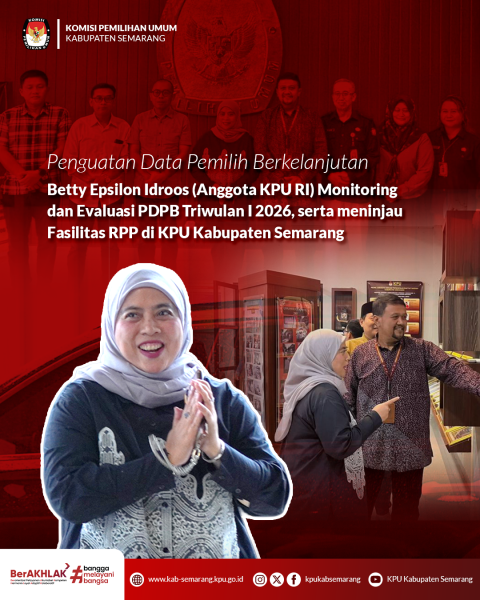 Ungaran - Komisi Pemilihan Umum Kabupaten Semarang terus menunjukkan komitmennya dalam menjaga kualitas demokrasi melalui pelaksanaan Program Strategis Nasional (PSN). Fokus utama yang menjadi perhatian meliputi Pemutakhiran Data Pemilih Berkelanjutan (PDPB), penguatan sistem informasi kepemiluan, serta peningkatan sosialisasi dan pendidikan pemilih kepada masyarakat. Komitmen tersebut diperkuat melalui kegiatan Monitoring dan Evaluasi PDPB Triwulan I Tahun 2026 yang dilaksanakan di KPU Kabupaten Semarang pada Selasa (10/2/2026). Kegiatan ini dihadiri oleh Anggota KPU RI, Betty Epsilon Idroos, yang memberikan arahan sekaligus penguatan kepada jajaran penyelenggara terkait pentingnya akurasi dan keberlanjutan pemutakhiran data pemilih sebagai fondasi utama penyelenggaraan pemilu yang kredibel. Selain agenda monitoring dan evaluasi, Betty Epsilon Idroos juga meninjau fasilitas Rumah Pintar Pemilu (RPP) KPU Kabupaten Semarang sebagai sarana edukasi demokrasi bagi masyarakat. Peninjauan ini didampingi oleh jajaran Anggota dan Sekretaris KPU Provinsi Jawa Tengah. Melalui kegiatan ini, KPU Kabupaten Semarang menegaskan komitmennya untuk terus meningkatkan kualitas layanan kepemiluan, memperkuat tata kelola data pemilih, serta menghadirkan pendidikan demokrasi yang inklusif dan berkelanjutan bagi seluruh masyarakat Kabupaten Semarang.