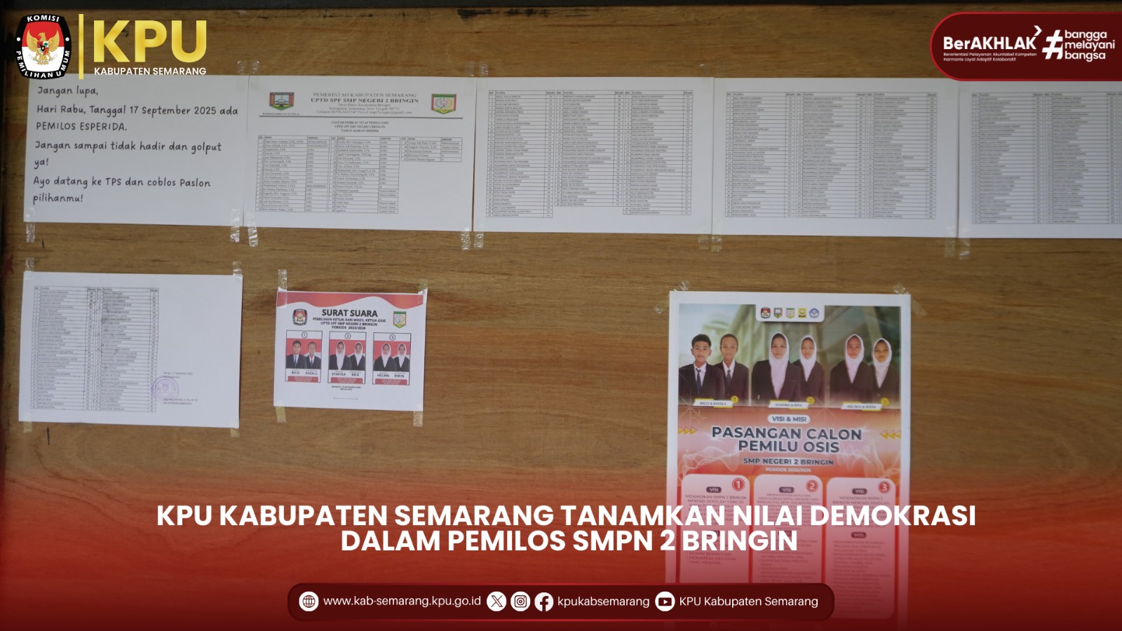 Bringin - KPU Kabupaten Semarang terus menanamkan nilai-nilai demokrasi sejak dini melalui kegiatan Pemilihan Ketua dan Wakil Ketua OSIS (Pemilos). Pada Rabu (17/09/2025), KPU Kabupaten Semarang hadir di SMPN 2 Bringin untuk memberikan edukasi demokrasi sekaligus mendampingi proses pemungutan suara.