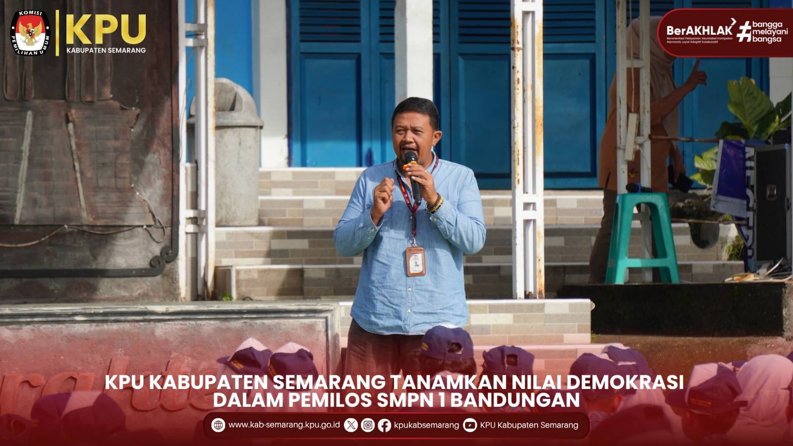Bandungan - KPU Kabupaten Semarang kembali menunjukkan komitmennya dalam menanamkan nilai-nilai demokrasi sejak dini melalui kegiatan Pemilihan Ketua OSIS (PEMILOS) yang digelar di SMPN 1 Bandungan pada, Jumat (07/11/2025). Dalam kegiatan tersebut, hadir Ketua KPU Kabupaten Semarang, Bambang Setyono, S.H., yang turut menjadi narasumber dan memberikan pembekalan kepada para siswa mengenai pentingnya berpartisipasi dalam proses pemilihan.
