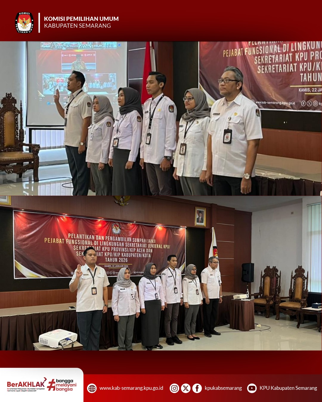 Ungaran - KPU Kabupaten Semarang mengikuti kegiatan Pelantikan dan Pengambilan Sumpah/Janji Pejabat Fungsional Penata Kelola Pemilihan Umum yang diselenggarakan oleh Sekretaris Jenderal KPU Republik Indonesia secara daring pada Kamis, (22/01/2026). Kegiatan tersebut diikuti oleh Ketua dan Anggota KPU Kabupaten Semarang, Sekretaris, serta seluruh jajaran KPU Kabupaten Semarang.