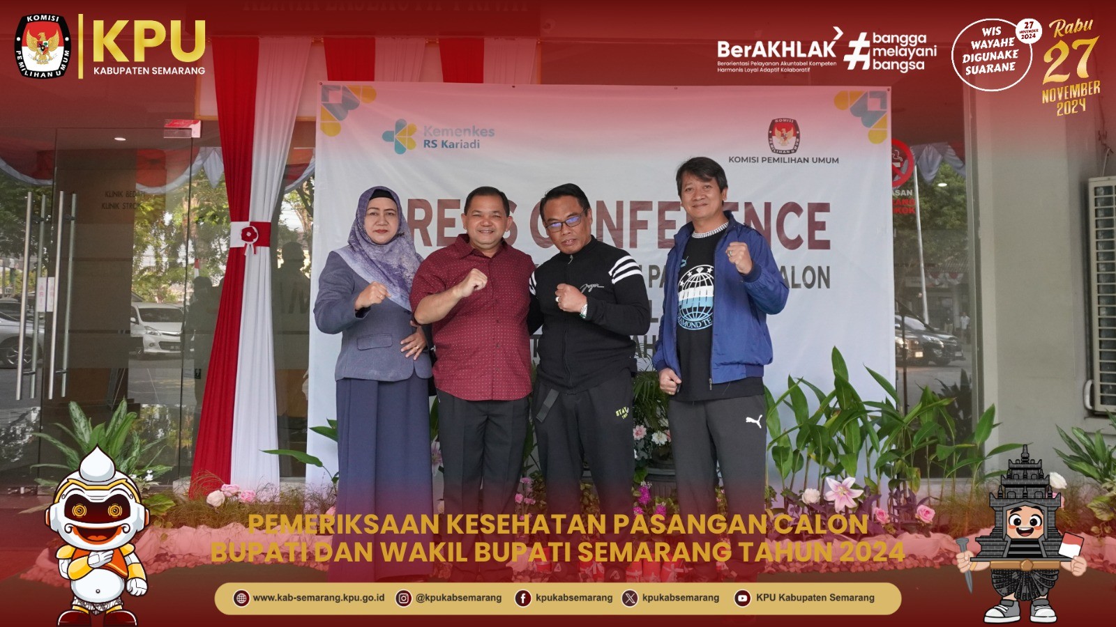 Dua bakal pasangan calon Bupati dan wakil Bupati Semarang dalam Pilbup Semarang 2024, yaitu H. Ngesti Nugraha, S.H., M.H. bersama Dra. Hj. Nur Arifah serta Nurul Huda, S.H. dengan Yarmuji, A.Md. telah menjalani pemeriksaan kesehatan di RSUP dr. Kariadi, Semarang, pada Sabtu (31/8/2024) hingga Senin (2/8/2024).