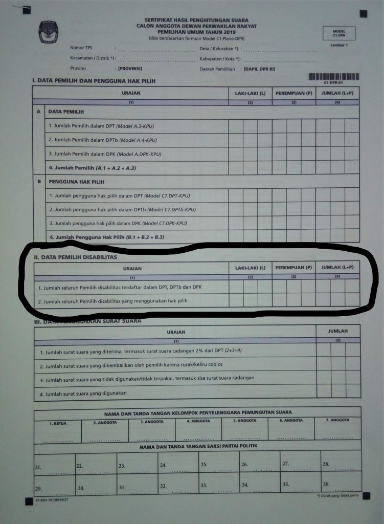 Contoh Formulir Model C1-DPR dengan Kolom Data Pemilih Disabilitas