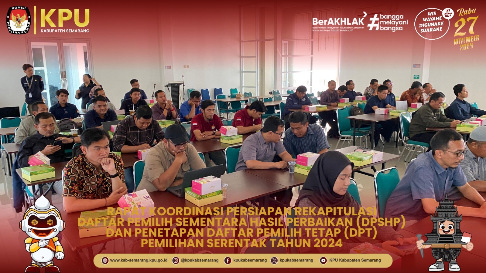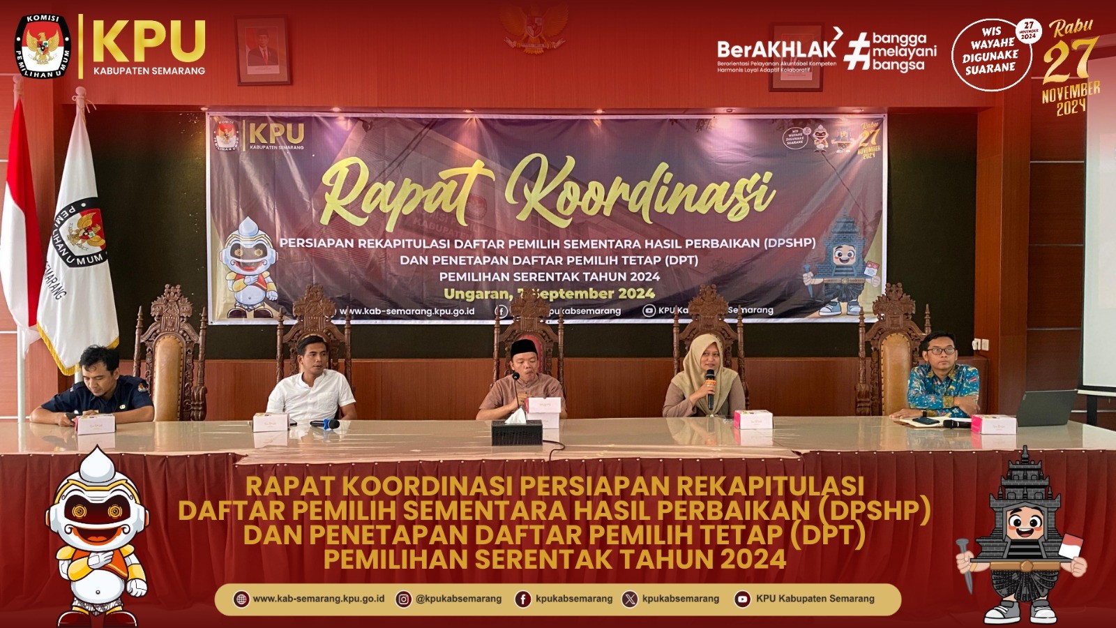 KPU Kabupaten Semarang menggelar rapat koordinasi untuk mempersiapkan penetapan Daftar Pemilih Tetap (DPT) Pemilihan Serentak Tahun 2024. Kegiatan ini diadakan pada hari Sabtu (7/9/2024) di Aula lantai 3 Kantor KPU Kabupaten Semarang dan di hadiri oleh Bawaslu Kab. Semarang, Ketua dan Anggota PPK Divisi Perencanaan, Data dan Informasi se-Kabupaten Semarang .