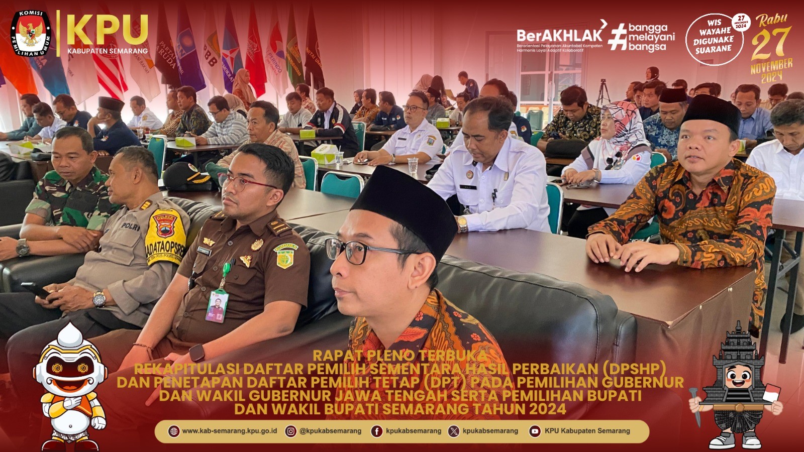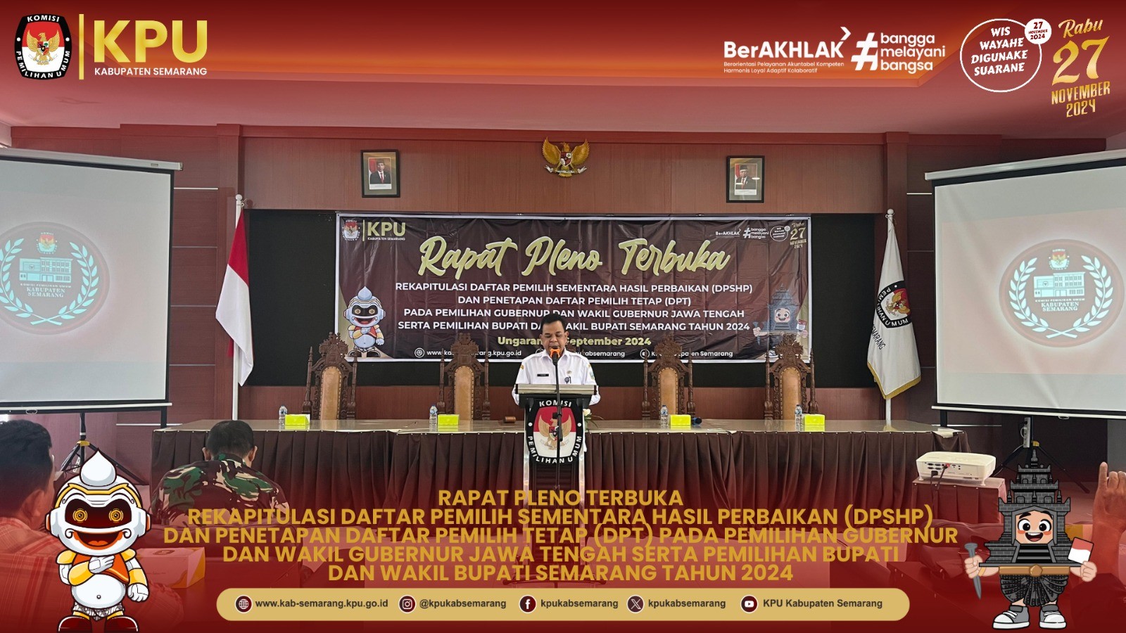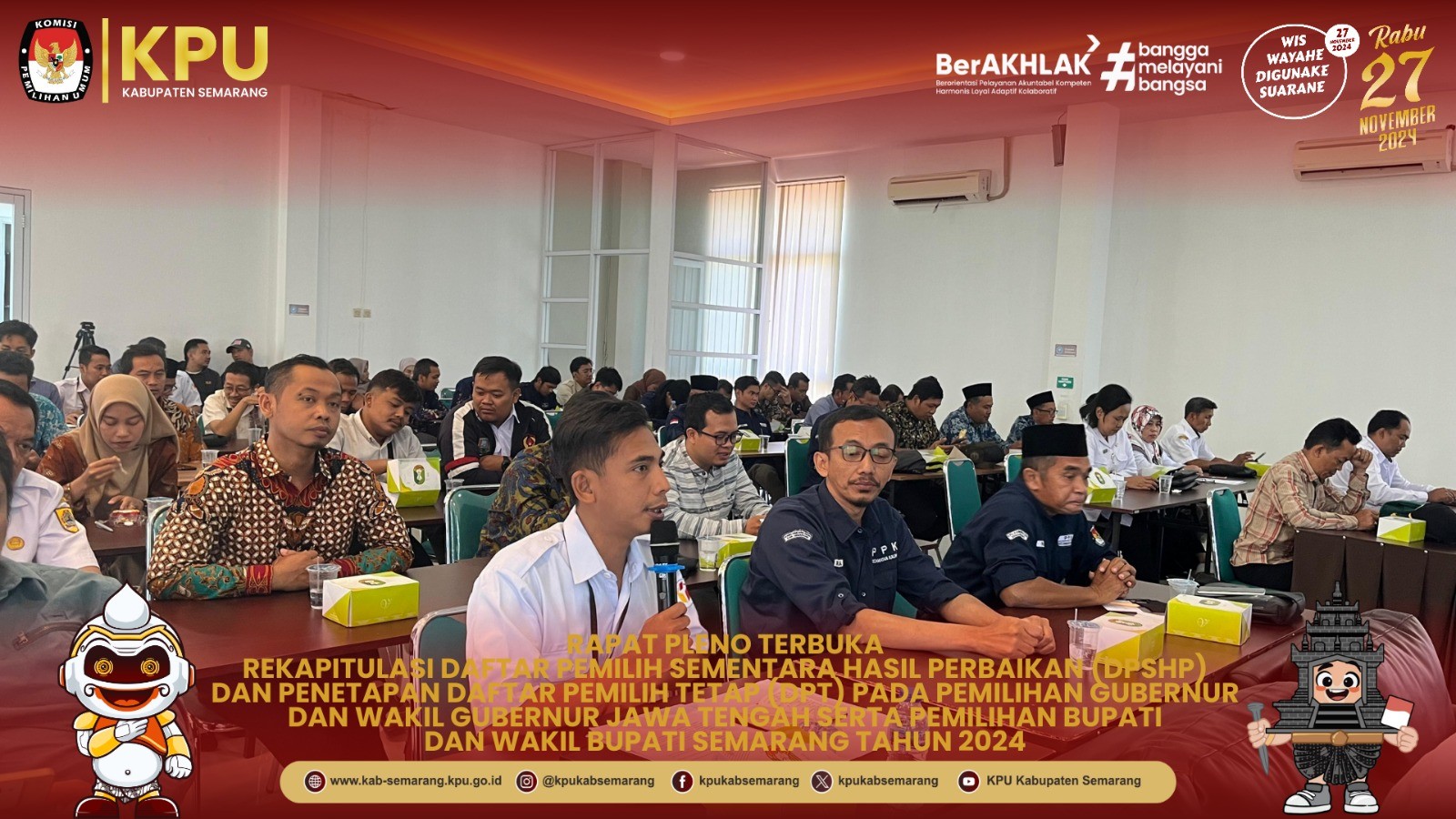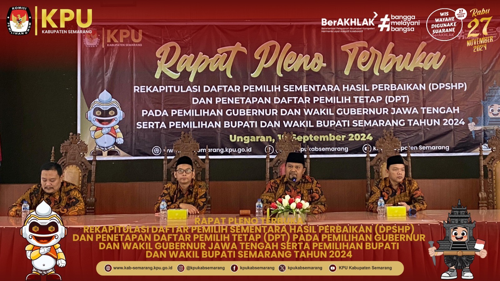 KPU Kabupaten Semarang telah melaksanakan Rapat Pleno Terbuka Rekapitulasi Daftar Pemilih Sementara Hasil Perbaikan (DPSHP) dan Penetapan Daftar Pemilih Tetap (DPT) tingkat Kabupaten Semarang untuk Pemilihan Gubernur dan Wakil Gubernur Jawa Tengah serta Pemilihan Bupati dan Wakil Bupati Semarang pada Rabu, (18/09/2024)