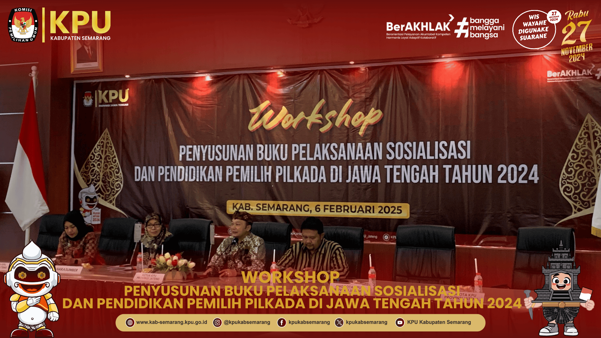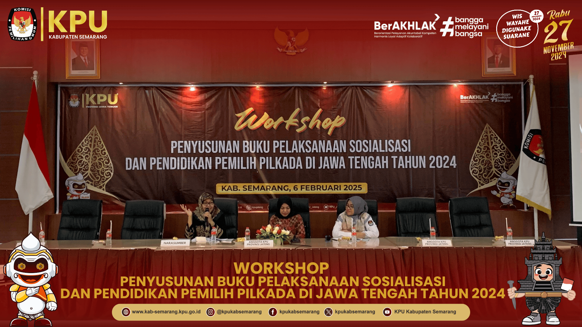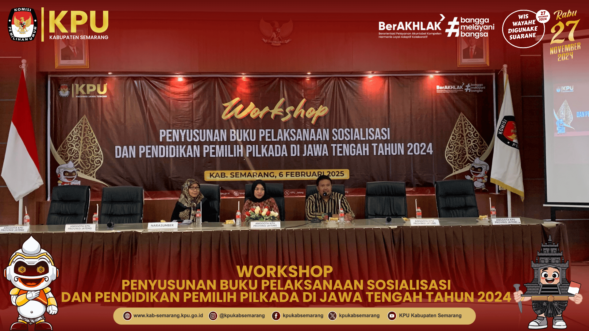 Ungaran - KPU Provinsi Jawa Tengah menggelar Workshop Penyusunan Buku Pelaksanaan Sosialisasi dan Pendidikan Pemilih Pilkada 2024 di Aula lantai 3 Kantor KPU Kabupaten Semarang, Kamis (6/2/2025)