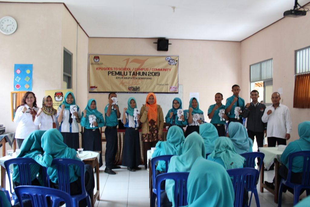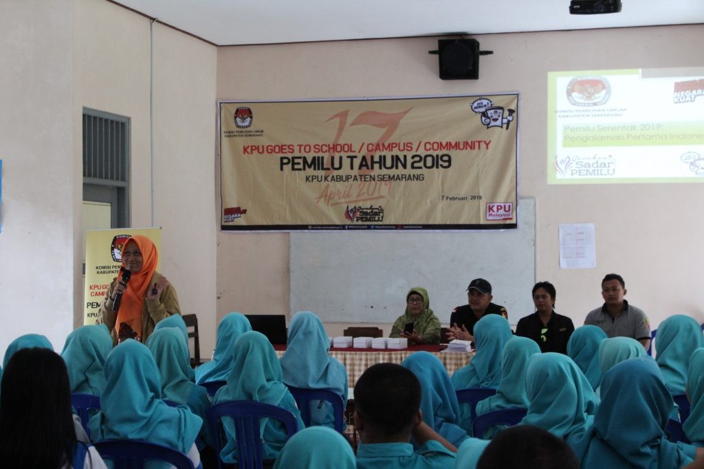 Pabelan (7/2), KPU Kabupaten Semarang menggelar sosialisasi Pemilu Serentak 2019 kepada pemilih pemula di SMK Negeri 1 Pabelan. Dalam sosialisasi tersebut diantaranya disosialisasikan pula 5 (lima) specimen surat suara sebagaimana ukuran aslinya.