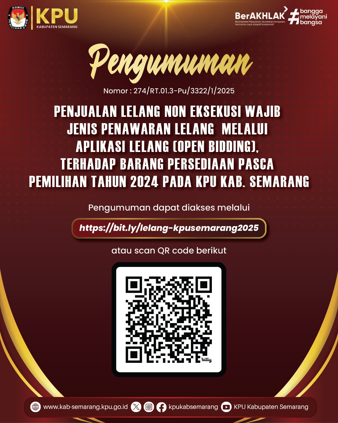 Pengumuman Lelang Barang Persediaan Pasca Pemilihan KPU Kabupaten Semarang Kamis, 07 Agustus 2025 08:00 114 Pengumuman Lelang Logistik Pemilihan dapat >> LIHAT DISINI << Bagikan: Telah dilihat 114 kali