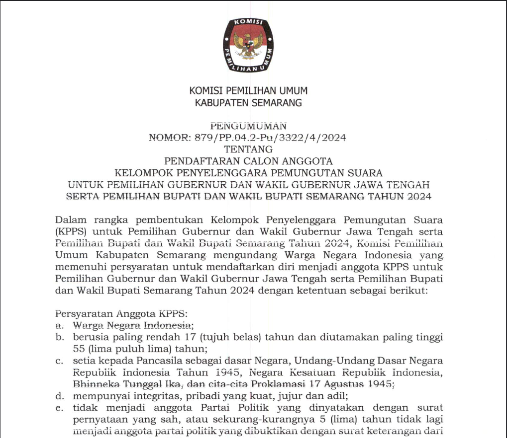 Berikut Pengumuman Pendaftaran Kelompok Penyelenggara Pemungutan Suara (KPPS) untuk Pemilihan Gubernur dan Wakil Gubernur Jawa Tengah serta Pemilihan Bupati dan Wakil Bupati Semarang Tahun 2024