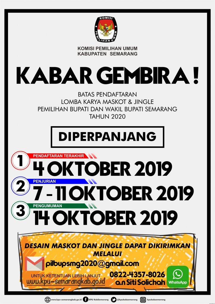 Menyusuli Pengumuman KPU Kabupaten Semarang Nomor 377/PP.01.2-PU/3322/KPU-Kab/VIII/2019 tanggal 15 Agustus 2019, berikut kami sampaikan Perubahan Jadwal Penerimaan Hasil Karya dan Pengumuman Pemenang Lomba Maskot dan Jingle Pemilihan Bupati dan Wakil Bupati Semarang Tahun 2020, sebagaimana tautan dibawah ini: