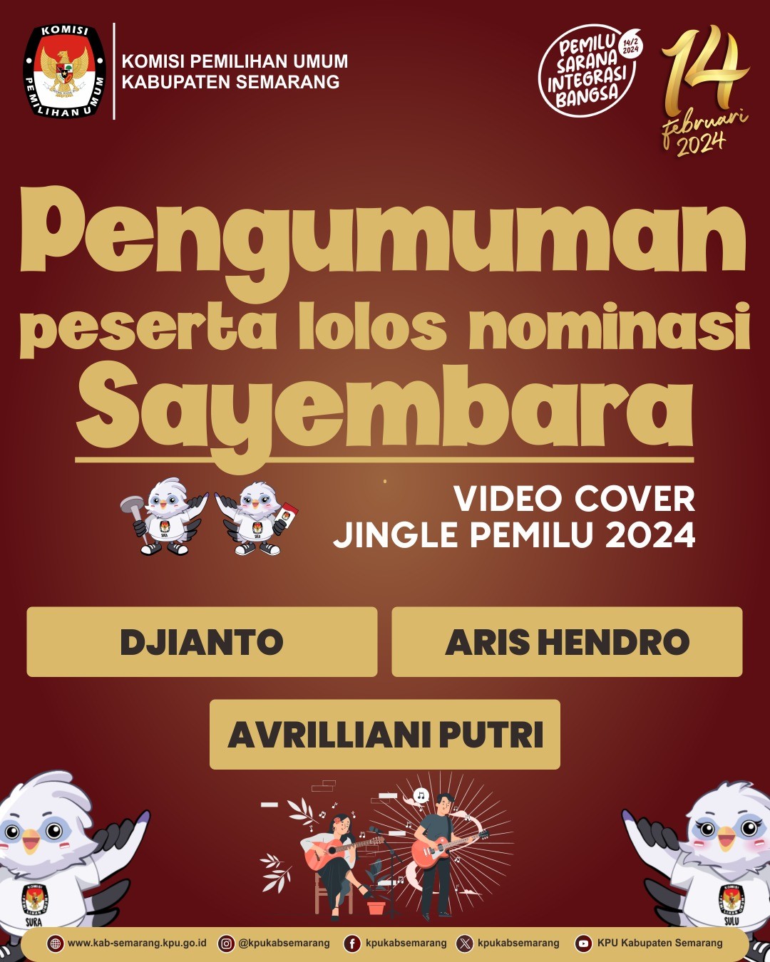 Berikut adalah Pengumuman Peserta Lolos Nominasi Sayembara Video Cover Jingle Pemilu 2024