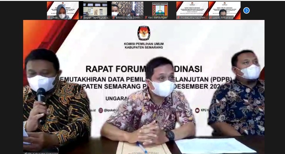 Ungaran (28/12/2021), KPU Kabupaten Semarang menggelar Rapat Forum Koordinasi Pemutakhiran Data Pemilih (PDPB) Bulan Desember 2021 melalui daring. Rapat yang dipimpin secara langsung oleh Ketua KPU Kabupaten Semarang, Maskup Asyadi tersebut diselenggarakan dalam rangka menindaklanjuti Pasal 8 Peraturan Komisi Pemilihan Umum Republik Indonesia Nomor 6 Tahun 2021 tentang Pemutakhiran Data Pemilih Berkelanjutan.