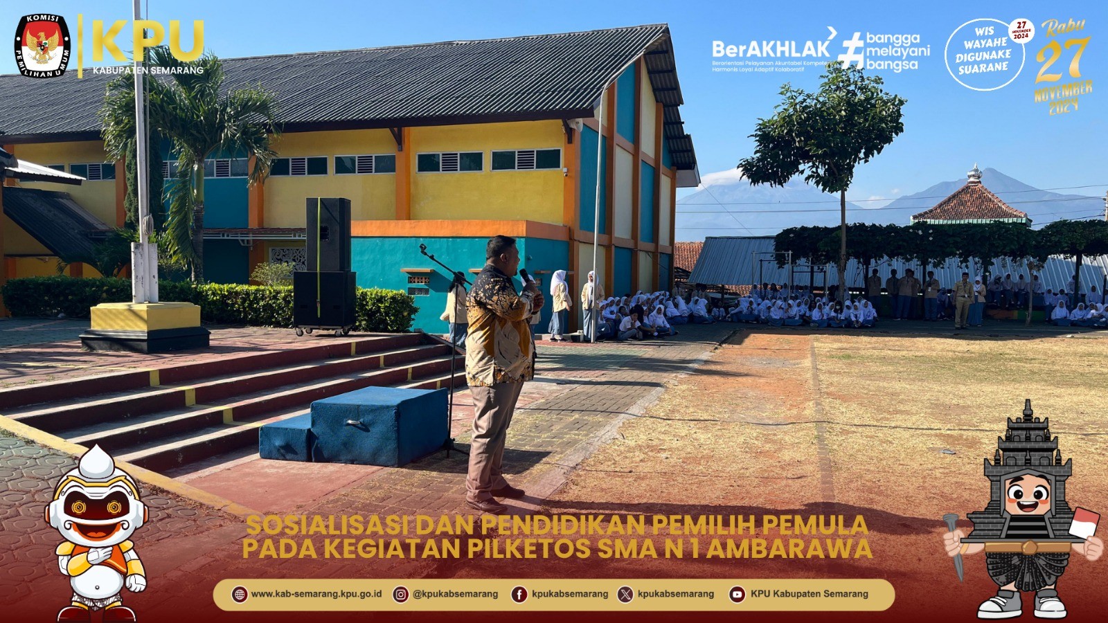 KPU Kabupaten Semarang melaksanakan Sosialisasi Tahapan Pilkada 2024 pada Apel Pemilihan Ketua OSIS (PILKETOS) di SMA N 1 Ambarawa (26/08/2024).