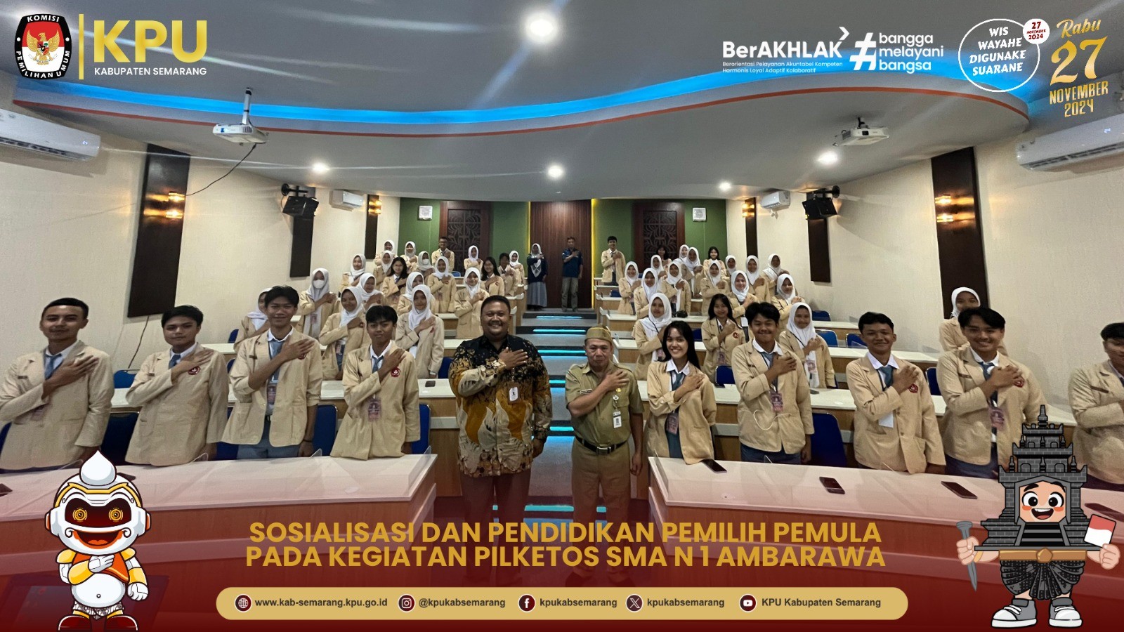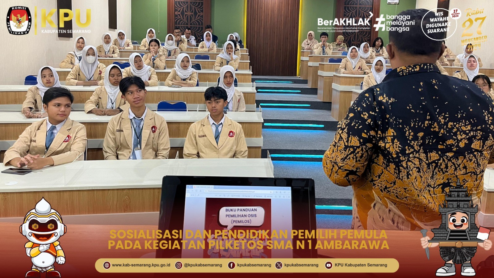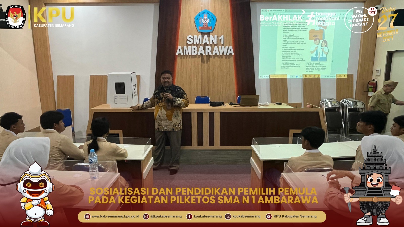 "Adik adik disini yang sudah berumur 17 tahun memiliki hak pilih untuk memilih Gubernur dan Wakil Gubernur Jawa Tengah serta Bupati dan Wakil Bupati Semarang pada hari Rabu, 27 November 2024 nanti, Pemuda memiliki idealisme untuk mendorong demokrasi ke arah yang lebih baik, maka partisipasi pemuda menjadi tolak ukur keberhasilan demokrasi di Indonesia" jelas Bambang