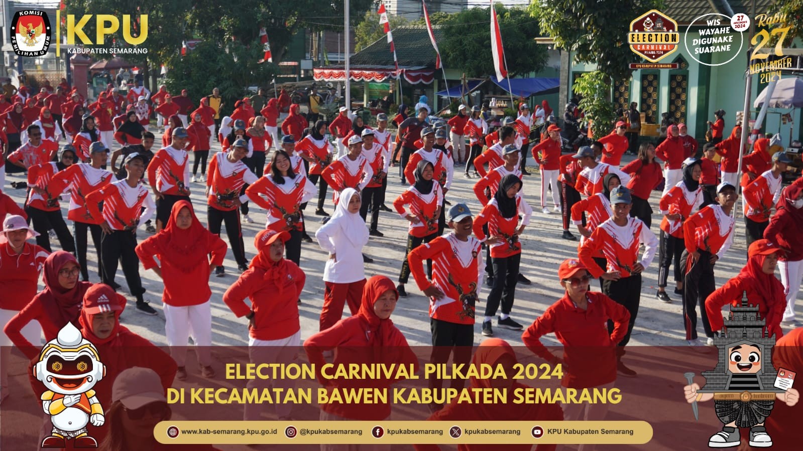 KPU Kabupaten Semarang menyelenggarakan election carnival di setiap kecamatan. Kali ini, election carnival dirangkai dalam bentuk kegiatan senam bersama, jalan sehat, dengan hiburan solo organ di halaman kantor Kecamatan Bawen (09/08/2024).