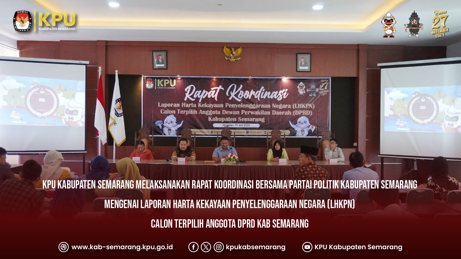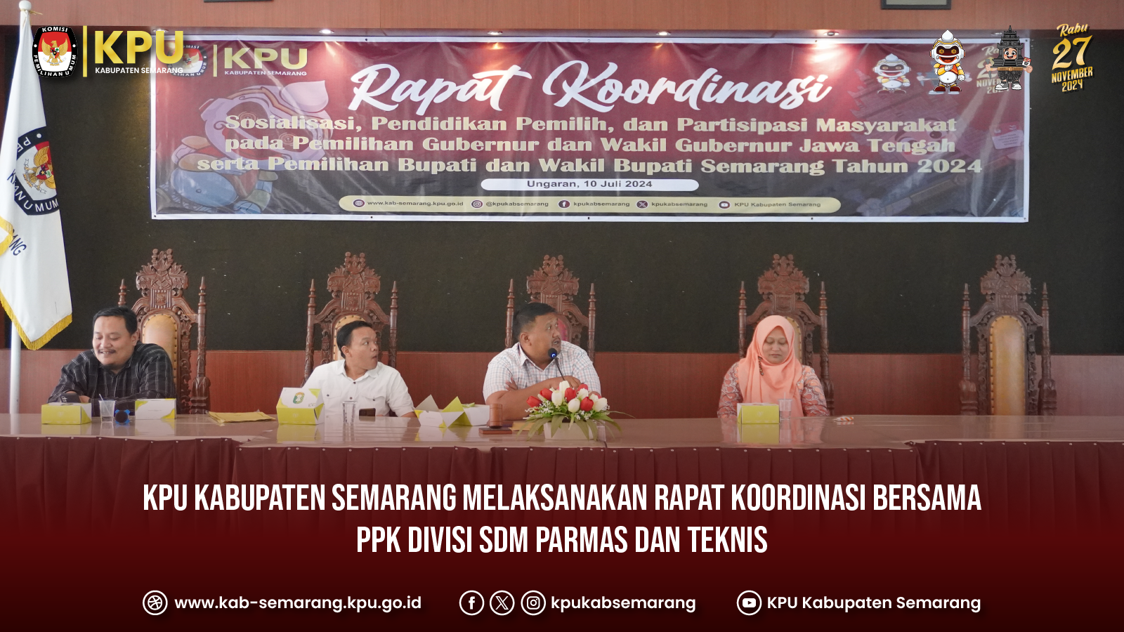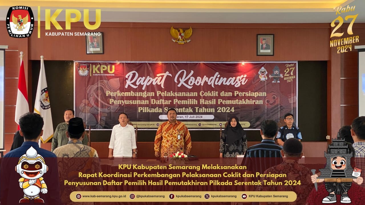 Ungaran, kab-semarang.kpu.go.id-KPU Kabupaten Semarang menyelenggarakan Kegiatan Rapat Koordinasi Perkembangan Pelaksanaan Coklit dan Persiapan Penyusunan Daftar Pemilih Hasil Pemutakhiran Pilkada Serentak Tahun 2024 (17/7) Acara ini diikuti oleh Ketua Panitia Pemilihan Kecamatan (PPK) dan Anggota Panitia Pemilihan Kecamatan (PPK) Divisi Perencanaan, Data dan Informasi (Rendatin) se-Kabupaten Semarang. Rapat Koordinasi ini dibuka secara langsung oleh Ketua KPU Kabupaten Semarang, Bambang Setyono. Dalam sambutannya, Bambang menyampaikan antara lain agar PPK Rendatin menyiapkan pelaksanaaan pemutakhiran data pemilih paska coklit tingkat Kecamatan salah satunya dengan melakukan analisa kegandaan data pemilih pada Aplikasi Sidalih; Selanjutnya. Penyampaian materi oleh Anggota KPU Kabupaten Semarang Divisi Perencanaan, Data, dan Informasi, Agus Setiyoko selaku yang antara lain membahas mengenai studi kasus dan tindak lanjut atas pelaksanaan Coklit di Kabupaten Semarang, pelaksanaan pemutakhiran data paska coklit, hingga melakukan pengecekan dan validasi data.
