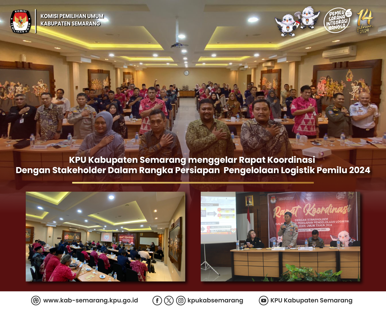 Bandungan (18/10), KPU Kabupaten Semarang menggelar Rapat Koordinasi Dengan Stakeholder Dalam Rangka Persiapan Pengelolaan Logistik Pemilu 2024. Acara yang berlangsung di Hotel Griya Persada Bandungan ini dihadiri oleh Komisioner KPU Kabupaten Semarang, Pejabat Struktural, Bawaslu Kabupaten Semarang, Dinas Perhubungan Kabupaten Semarang, BPBD Kabupaten Semarang, Satpol PP dan Damkar Kabupaten Semarang, Kesbangpol Kabupaten Semarang, Camat se-Kabupaten Semarang serta Ketua PPK pada Pemilu Tahun 2024. Ketua KPU Kabupaten Semarang, Maskup Asyadi dalam sambutannya menyampaikan bahwa update informasi terkait logistik Pemilu 2024 pasca keluarnya PKPU Nomor 14 Tahun 2023 diikuti dengan PKPU 16 Tahun 2023 Tentang Perubahan Atas Peraturan Komisi Pemilihan Umum Nomor 14 Tahun 2023 Tentang Perlengkapan Pemungutan Suara, Dukungan Perlengkapan Lainnya, dan Perlengkapan Pemungutan Suara Lainnya dalam Pemilihan Umum perlu disampaikan kepada stakeholder terkait untuk memberikan gambaran yang utuh perihal pengadaan dan tahapan logistik Pemilu 2024. Hadir sebagai narasumber Kabagops Polres Semarang AKP Suwondo, S.H. dan Tris Adi Sukoco, S.Hut dari BMKG Stasiun Klimatologi Jawa Tengah. AKP Suwondo, S.H. menyampaikan bahwa Polres Semarang siap mengawal dan memastikan keamanan selama Tahapan Pemilu 2024 berlangsung dengan dukungan personil serta sarana prasarana yang memadai. Polres Semarang juga telah melakukan pemetaan TPS rawan serta pelaksanaan program cooling system untuk meredam gejolak yang mungkin timbul saat pelaksanaan tahapan berlangsung. Sementara Tris Adi Sukoco, S.Hut, PMG Madya Stasiun Klimatologi Jawa Tengah menyampaikan bahwa Bulan Januari dan Februari 2024 merupakan puncak musim hujan sehingga pengamanan terkait logistik yang sebagian besar berbahan dasar kertas harus diperhatikan baik pada proses penyimpanan maupun saat distribusi logistik berlangsung.