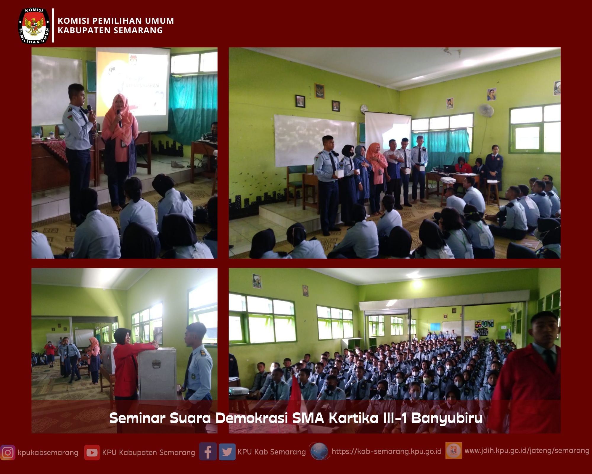 Banyubiru (27/09) SMA Kartika III-1 Banyubiru menggelar Seminar dengan tema Suara Demokrasi. Kegiatan diikuti oleh 205 siswa kelas X dengan didampingi wali kelas masing-masing, pengurus MPK, dan pengurus OSIS yang akan demisioner. Winarni selaku Kepala Sekolah SMA Kartika III-1 Banyubiru menyampaikan terimakasih kepada KPU Kabupaten Semarang yang telah memberikan ilmu tentang demokrasi. Kegiatan seminar dilaksanakan dalam rangka implementasi kurikulum merdeka belajar dan menyongsong Pemilihan Ketua OSIS (Pemilos). Dengan pengarahan dan simulasi Winarni berharap siswa yang menjadi panitia meski merupakan siswa produk hasil daring tetap dapat melaksanakan kegiatan Pemilos seperti pelaksanaan pemungutan suara pada Pemilu sebenarnya. Siti Solichah Anggota KPU Kabupaten Semarang menyampaikan materi tentang demokrasi, Pemilu 2024 dan Pemilos. Setelah menyampaikan materi, Solichah bersama panitia melaksanakan simulasi pemungutan suara. Antusias dari siswa terlihat selama proses kegiatan dengan aktifnya berdialog dan rasa ingin tahu yang besar dengan menyampaikan pertanyaan-pertanyaan yang berkaitan dengan Pemilu maupun Pemilos.