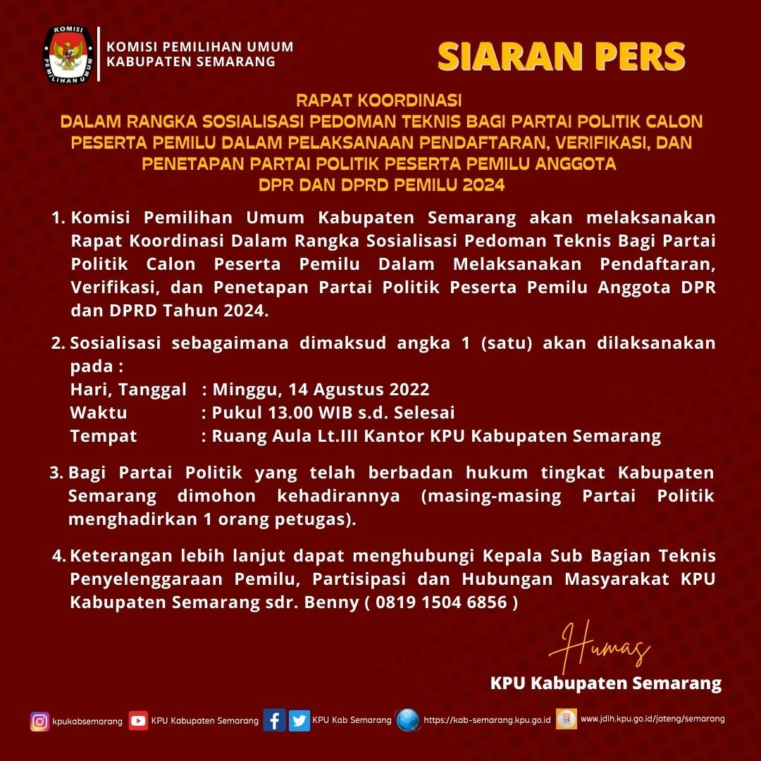 Koordinasi dimulai tanggal 10 Agustus 2022, KPU Kabupaten Semarang berkunjung ke Markas Kodim 0714 Salatiga, ditemui oleh Dandim 0714 Salatiga, Letkol Inf. Ade Pribadi Siregar, S.E., M.Si.