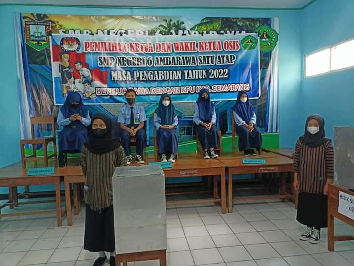 Ambarawa, (15/12) SMP Negeri 6 Ambarawa Satu Atap menyelenggarakan Pemilihan Ketua Organisasi Siswa Intra Sekolah (Pemilos) masa bakti 2022/2023. Penyelenggaraan Pemilos ini dilaksanakan dengan menggandeng KPU Kabupaten Semarang dalam rangka untuk memberikan pengalaman dan pemahaman kepada siswa akan pentingnya berdemokrasi. ”Pemilihan dengan sistem pemilu ini kita lakukan untuk memberikan pendidikan demokrasi dengan bijak, dan mengenalkan sejak dini tentang tahapan pemilu kepada peserta didik. Selain itu pelaksanaan pemilihan OSIS harus dilakukan secara demokratis di mana semua peserta didik memiliki hak yang sama untuk pengambilan keputusan yang tidak dapat dipengaruhi oleh siapa pun.” ucap Kepala SMP Negeri 6 Ambarawa Satu Atap, Ridholina dalam sambutannya. Dalam pemilihan tersebut, SMP Negeri 6 Ambarawa Satu Atap bekerjasama dengan KPU Kabupaten Semarang dalam mempersiapkan logistik pemilihan berupa bilik suara, kotak suara, tinta, dan alat coblos. Pelaksanaan Pemilos tersebut mengedepankan protokol kesehatan dimana petugas dan pemilih memakai masker dan mencuci tangan sebelum masuk ke ruang TPS. Disamping itu, pencoblosan dilaksanakan 3 sesi agar tidak menimbukan kerumunan dan menjaga jarak. Pemilos ini diawali dengan proses penjaringan, seleksi, pelaksanaan kampanye dari para kandidat dengan pemaparan visi dan misi mereka, yang dilanjutkan dengan pemberian sosialiasi tata cara pencoblosan. Ada tiga calon ketua OSIS yang mendaftarkan diri, yakni Febri Eka dan Agustina Tri.H, Luluk Mutiara dan Arya Bhakti, Maulinda dan Iin Setyawati. Bapak Choiry selaku Guru Pembimbing berharap dengan adanya Pemilos diharapkan anak didiknya memahami alur, proses dan pelaksanaan pemilihan sehingga ke depannya tumbuh regenerasi petugas penyelenggara pemilu dan pemilihan yang akan datang. Pemilos diikuti oleh seluruh siswa SMP Negeri 6 Ambarawa Satu Atap yang berjumlah 165 siswa yang dibagi menjadi 3 sesi pencoblosan agar tidak menimbulkan kerumunan. Baik panitia, pemilih dan calon merupakan siswa itu sendiri sehingga lebih merasakan nuansa demokratis pada Pemilos ini.