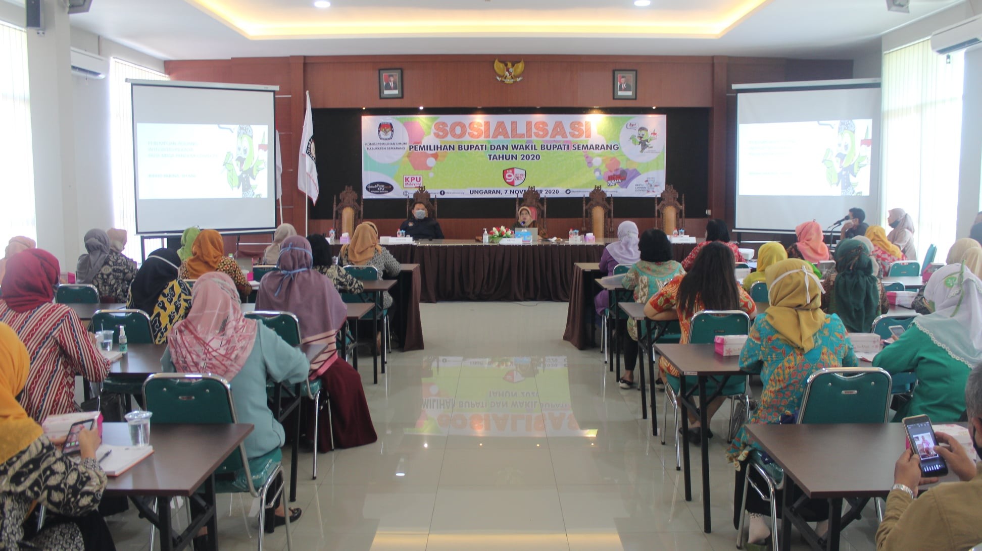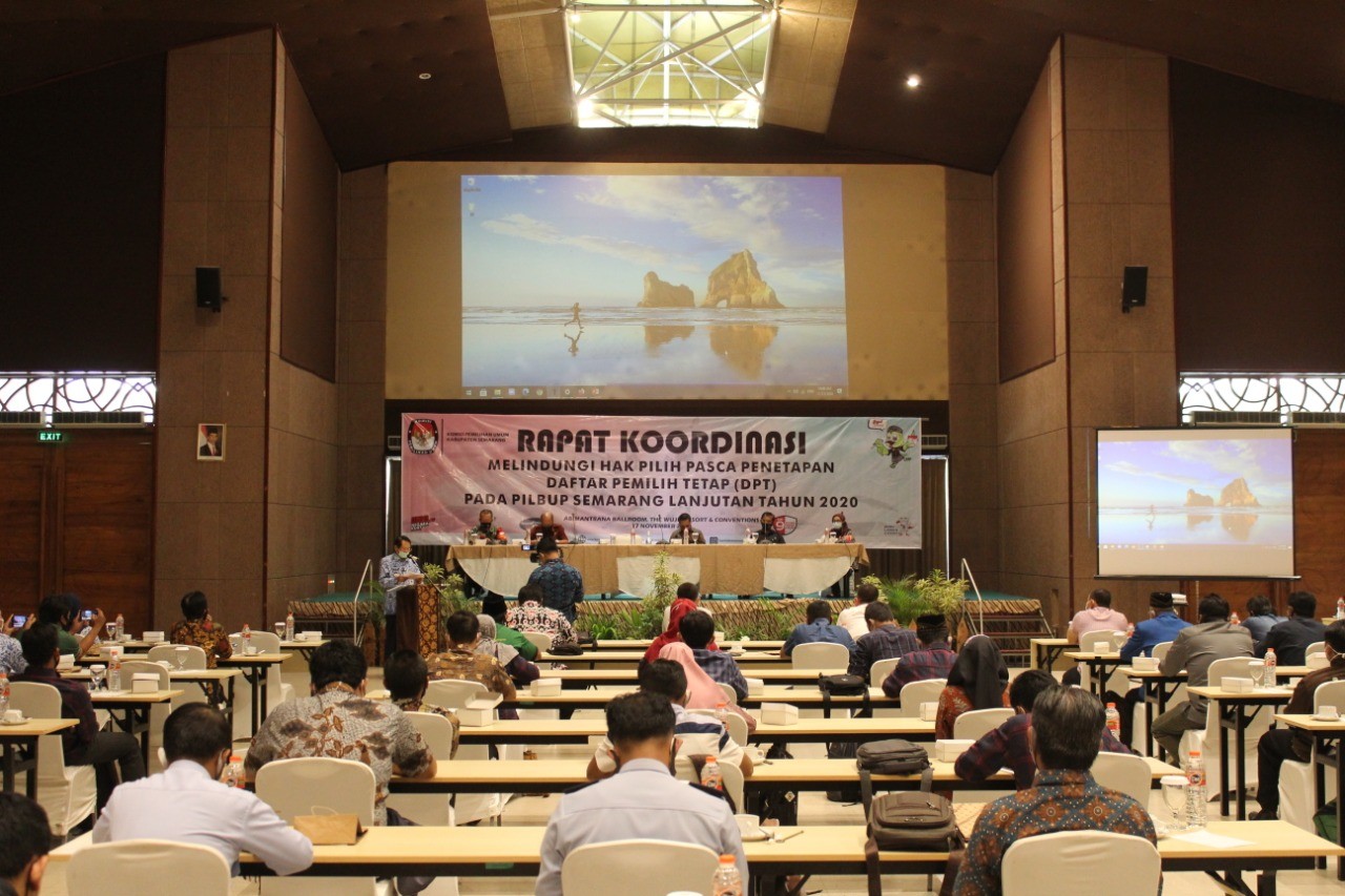 Bergas (17/11), KPU Kabupaten Semarang menyelenggarakan Rapat Koordinasi Melindungi Hak Pilih Pasca Penetapan Daftar Pemilih Tetap (DPT) pada Pilbup Semarang Lanjutan Tahun 2020 di The Wujil Resort & Conventions, Bergas, Kabupaten Semarang. Kegiatan yang menghadirkan Khoirunnisa Nur Agustyati selaku Direktur Eksekutif Perkumpulan untuk Pemilu Demokrasi (Perludem) sebagai narasumber tunggal tersebut dilaksanakan dengan menerapkan protokol kesehatan.