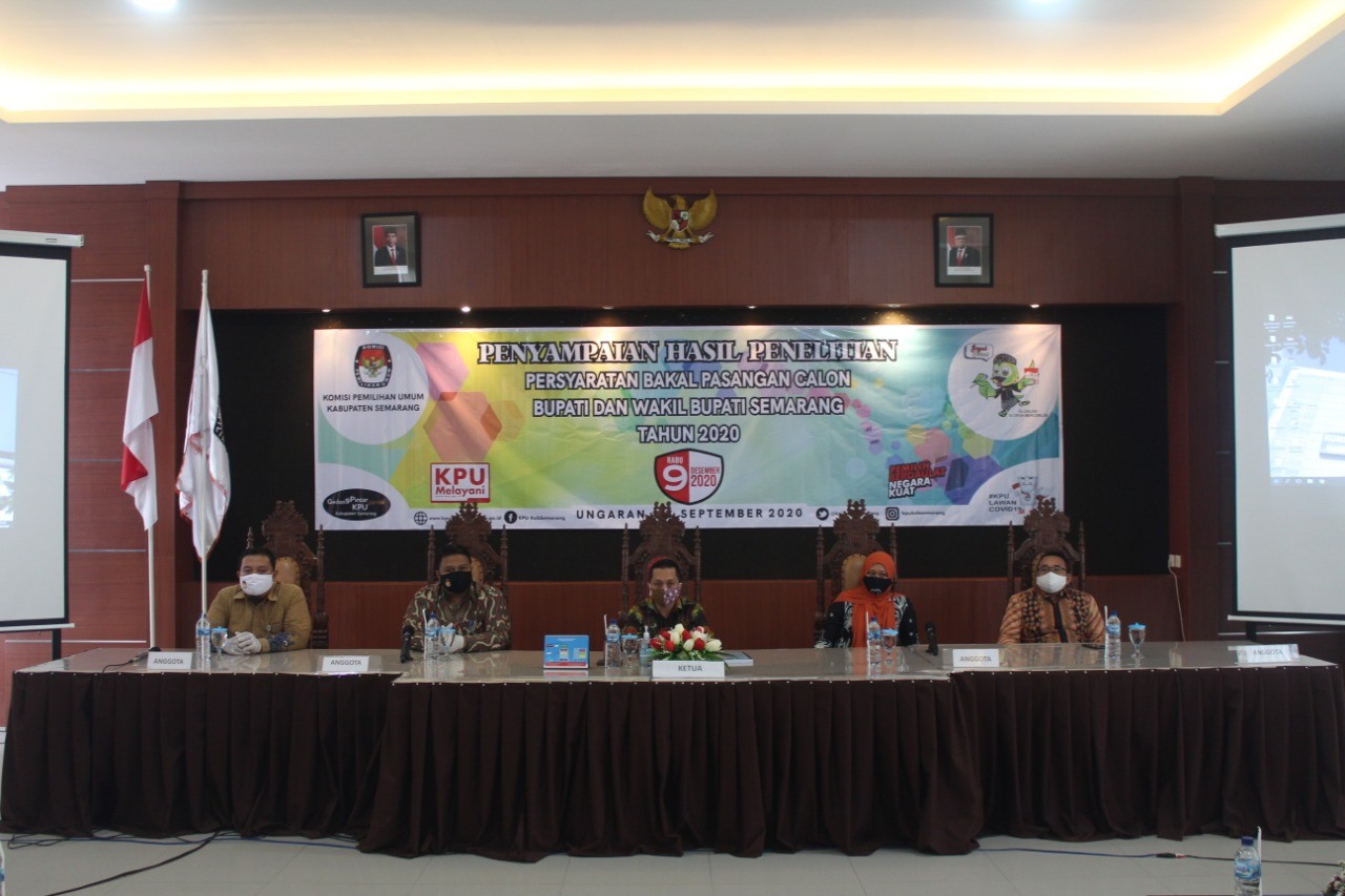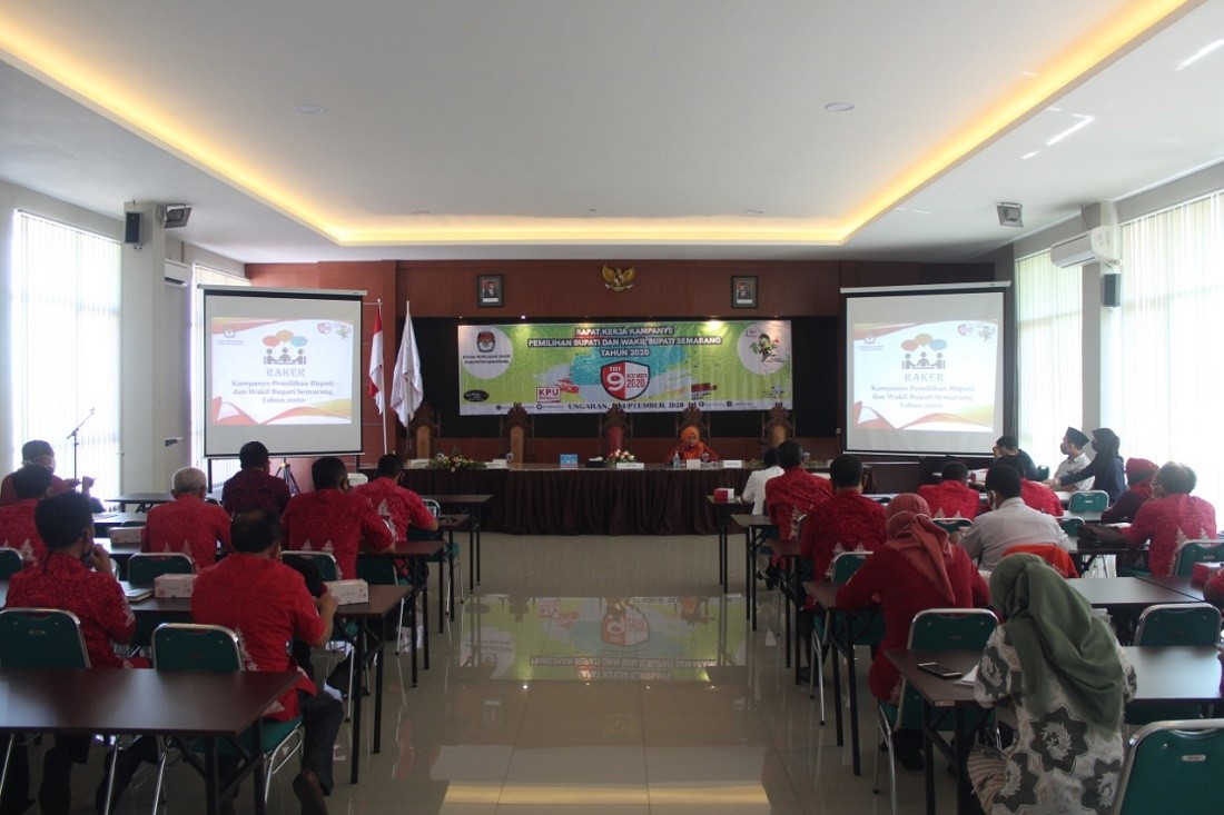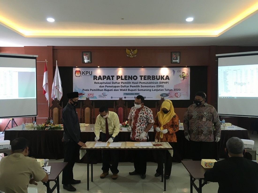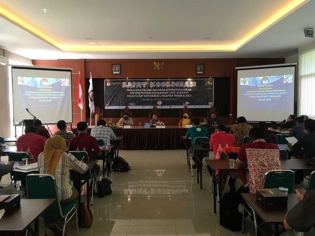 Ungaran (16/9), KPU Kabupaten Semarang menyelenggarakan Rapat Koordinasi Persiapan Pelaksanaan Kegiatan Perbaikan Daftar Pemilih Sementara (DPS) Oleh Panitia Pemungutan Suara (PPS) pada Pilbup Semarang Lanjutan Tahun 2020. Kegiatan yang dilaksanakan di Aula Lantai 3 Kantor KPU Kabupaten Semarang tersebut dilaksanakan dengan memperhatikan protokol kesehatan. Ketua KPU Kabupaten Semarang, Maskup Asyadi dalam sambutannya menyampaikan bahwa pengumuman Daftar Pemilih Sementara akan dimulai pada tanggal 19 September 2020 nanti. “Pengumuman DPS akan dimulai pada tanggal 19 September 2020 hingga 28 September 2020. Diharapkan agar masyarakat dapat memberikan masukan terhadap Daftar Pemilih Sementara (DPS) tersebut” ungkapnya. Anggota KPU Kabupaten Semarang Divisi Data dan Informasi, Bambang Setyono menambahkan bahwa menurut Pasal 14 ayat (11) PKPU Nomor 19 Tahun 2019 tentang Pemutakhiran Data dan Penyusunan Daftar Pemilih dalam Pemilihan Gubernur dan Wakil Gubernur, Bupati dan Wakil Bupati, dan/atau Walikota dan Wakil Walikota salinan DPS agar diumumkan di kantor desa/kelurahan dan di sekretariat/balai Rukun Tetangga (RT)/ Rukun Warga (RW) atau tempat-tempat strategis lainnya. Turut hadir dalam kegiatan tersebut Ketua dan Anggota Pemutakhiran Data Pemilih Panitia Pemilihan Kecamatan (PPK) se-Kabupaten Semarang.