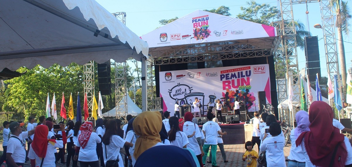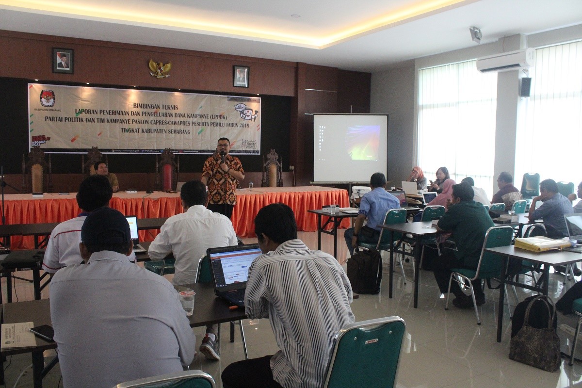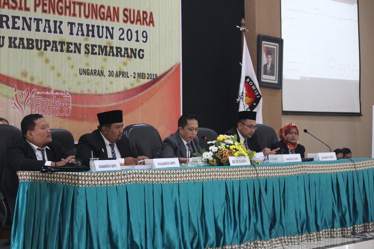 Genuk (30/4), KPU Kabupaten Semarang menggelar Rapat Pleno Terbuka Rekapitulasi Hasil Penghitung Suara Pemilu Serentak Tahun 2019 Tingkat Kabupaten Semarang di Ruang Balairung PP Paudni dan Dikmas Jawa Tengah. Rapat Pleno sebagaimana dimaksud dilaksanakan selama 3 hari yakni sejak tanggal 30 April 2019 hingga 2 Mei 2019. Rapat dihadiri oleh Panitia Pemungutan Kecamatam (PPK) se-Kabupaten Semarang, Bawaslu Kabupaten Semarang dan jajarannya, saksi Peserta Pemilu 2019 (baik yang mewakili partai politik, pasangan calon maupun perseorangan) serta masyarakat umum. Panitia Pemungutan Kecamatan (PPK) Jambu saat membuka Kotak Suara dan Memperlihatkan Formulir yang masih di dalam Sampul Dalam sambutannya, Ketua KPU Kabupaten Semarang, Maskup Asyadi menyampaikan bahwa penyelenggaraan Pemilu Serentak 2019 merupakan amanat Putusan Mahkamah Konsitusi Nomor 14/PUU-XI/2013. Selain itu dirinya juga mengapresiasi tingginya antusiasme dan tingkat partisipasi masyarakat dalam penyelenggaraan pemilu serentak ini yang diperkirakannya melebihi target nasional maupun lokal, yakni melebihi angka 80 persen tingkat kehadiran pemilih. Pada kesempatan yang lain Sekretaris Daerah Kabupaten Semarang, Gunawan Wibisono menyampaikan rasa syukur dan apresiasinya kepada seluruh pihak atas kelancaran penyelenggaraan Pemilu Serentak Tahun 2019 di Kabupaten Semarang. Petugas Pencatat saat Membubuhkan Hasil Perolehan yang dibacakan ke dalam Plano Sementara itu, Kapolres Semarang, AKBP Adi Sumirat mengharap pelaksanaan pleno rekapitulasi ini dapat berjalan dengan aman dan tertib serta mengajak para semua pihak yang hadir untuk memperhatikan proses rekapitulasi secara cermat. Rapat pleno berjalan lancar dan kondusif hingga ditutup pada tanggal 2 Mei 2019.