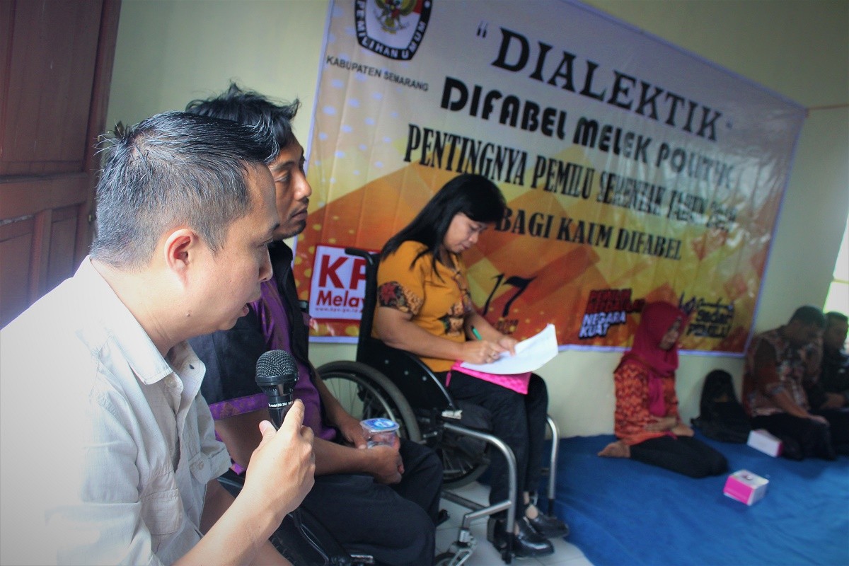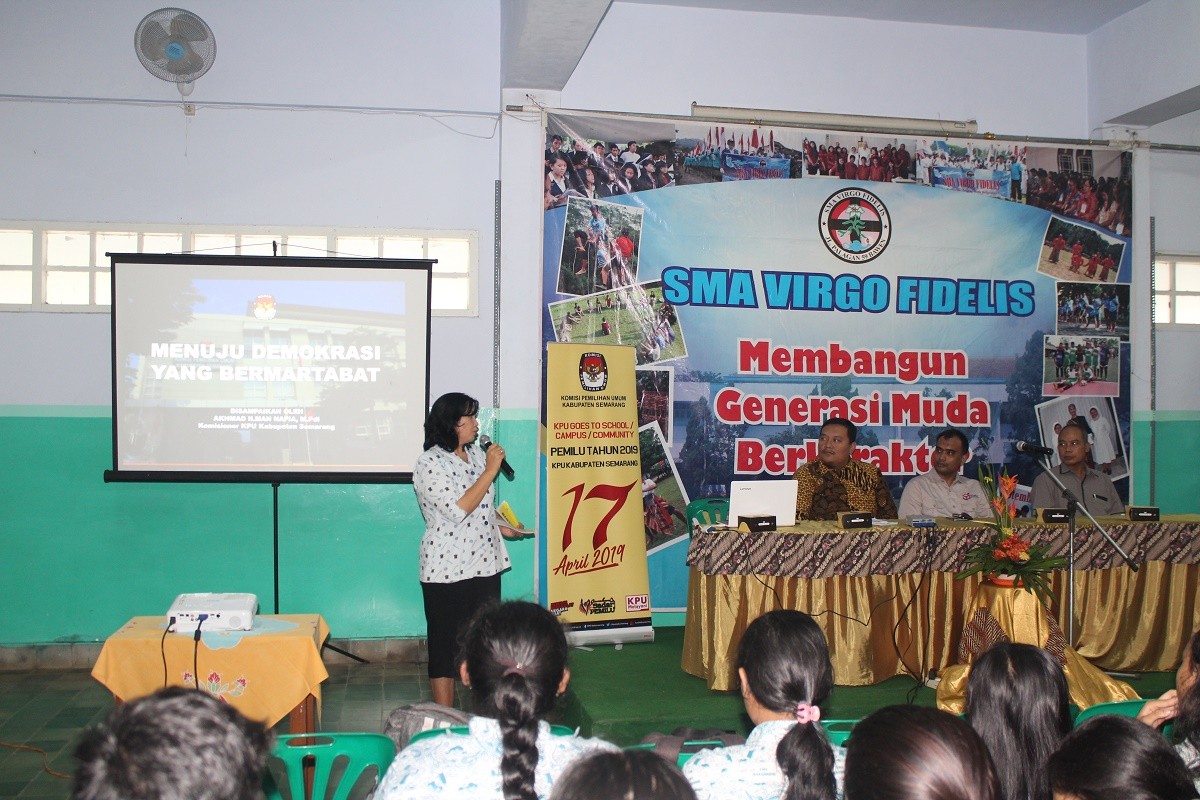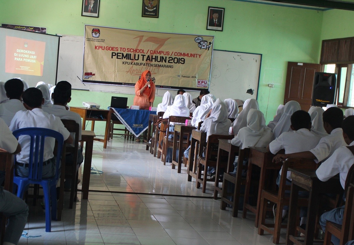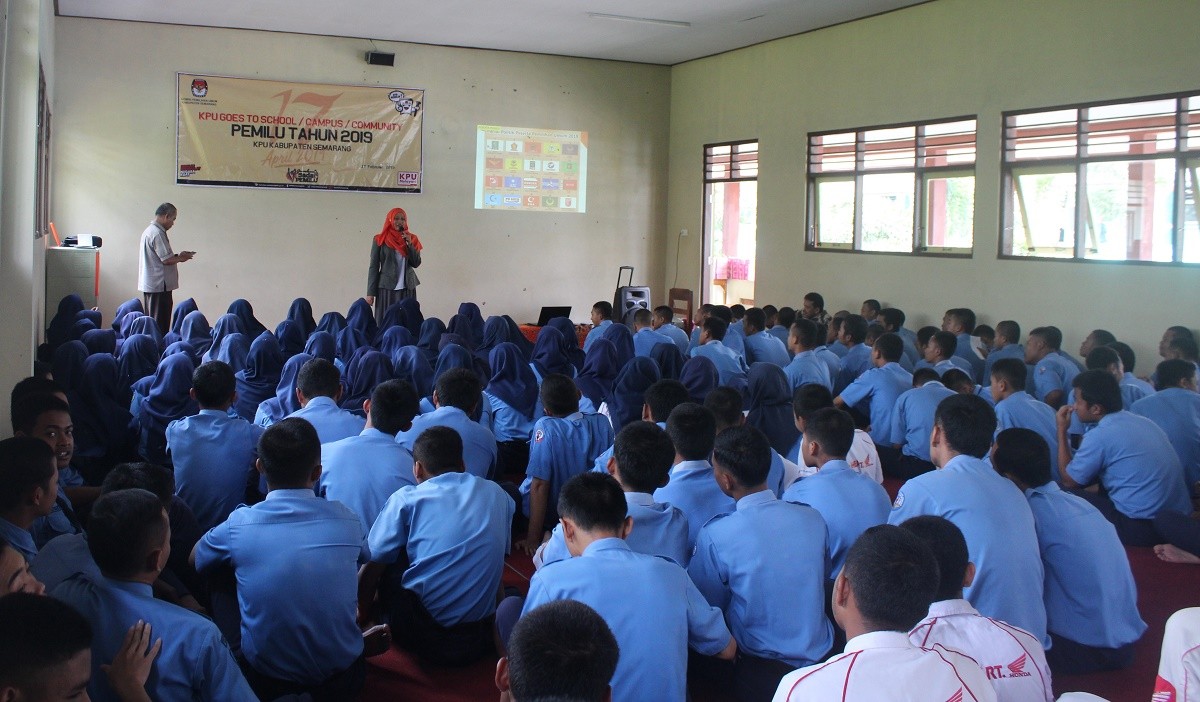 Susukan (26/2), KPU Kabupaten Semarang kembali menggelar sosialisasi Pemilu 2019 kepada pemilih pemula melalui Program KPU Goes to School. Pada kesempatan kali ini sosialisasi disampaikan terhadap sekitar 100 siswa dari SMK Muhammadiyah Susukan. Anggota KPU Kabupaten Semarang Divisi Sosialisasi, Pendidikan Pemilih, Partisipasi Masyarakat dan SDM, Siti Solichah, S.PdI mengajak agar siswa SMK Muhammadiyah Susukan sebagai pemilih generasi milenial untuk menjadi pemilih yang berdaulat. Ajakan tersebut disambut dengan penuh antusias dengan meneriakkan yel-yel “Siap menjadi pemilih berdaulat!”. Anggota KPU Kab. Semarang Divisi Sosialisasi, Pendidikan Pemilih, Partisipasi Masyarakat dan SDM, Siti Solichah, S.PdI saat Membagikan Kenang-Kenangan kepada Siswa SMK Muhammadiyah Susukan Pemilih berdaulat dalam hal ini, sebagaimana yang disampaikannya, yaitu pemilih yang menolak terlibat dalam politik transaksional seperti halnya politik uang, tidak turut menyebarkan hoaks dan ujaran kebencian serta menolak politisasi SARA. Selain itu disampaikan pula beberapa informasi mengenai lembaga penyelenggara pemilu, syarat menjadi pemilih, mekanisme pindah memilih, jenis surat suara, hingga cara memberikan suara di TPS (Tempat Pemungutan Suara).