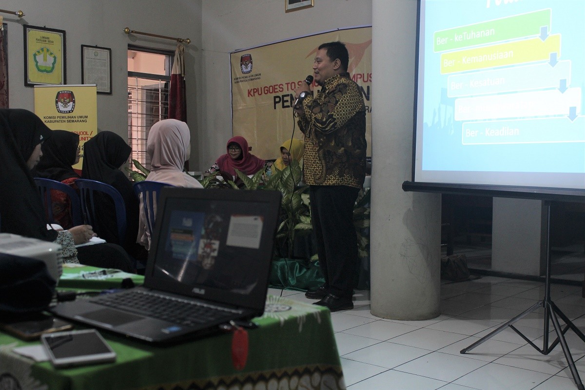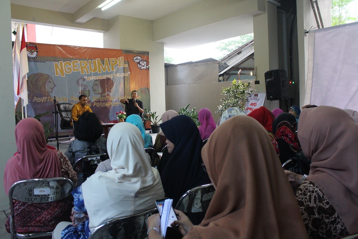 Ungaran (17/2), KPU Kabupaten Semarang kembali menyelenggarakan Nonton Bareng (Nobar) Debat Calon Presiden 2019 di halaman Gedung Kantor KPU Kabupaten Semarang. Acara nobar yang dihadiri diantaranya oleh tim kampanye pasangan calon, relawan demokrasi, Panitia Pemilihan Kecamatan (PPK), anggota dan pengurus Gabungan Organisasi Wanita (GOW) dan masyarakat umum tersebut berlangsung lancar, aman dan tertib. Sebagaimana diketahui, debat kedua kali ini mengusung format yang berbeda dibanding debat pertama. Salah satunya adalah bahwa debat dengan tema energi, pangan, infrastruktur, sumber daya alam, dan lingkungan hidup tersebut hanya diikuti oleh masing-masing calon presiden saja. Selain itu debat yang dipandu oleh Anisha Dashuki dan Tommy Tjokro selaku moderator tersebut tidak lagi terdapat kisi-kisi yang disampaikan terhadap para kandidat. Sehingga kerahasiaan dan spontanitas jawaban kedua kandidat tampak lebih menonjol. Antusiasme Masyarakat dalam Menghadiri Nobar Debat Capres di Halaman Gedung Kantor KPU Kabupaten Semarang Sebelumnya untuk menawali acara tersebut, KPU Kabupaten Semarang menghadirkan Dosen Hukum Universitas Darul Islam (Undaris), Tri Susilowati, S.H., M.Hum sebagai pemateri dalam diskusi pengantar nobar. Dosen Fakultas Hukum Undaris, Tri Susilowati, S.H., M.Hum saat Menyampaikan Materi dalam Diskusi Pengantar Nobar Debat Capres di Halaman Gedung Kantor KPU Kabupaten Semarang Pada kesempatan tersebut, Tri menekankan pentingnya kehadiran perempuan dalam ruang partisipasi politik. Hal ini menurutnya perlu didorong terutama untuk memasukkan agenda dan kepentingan perempuan dalam kebijakan publik.