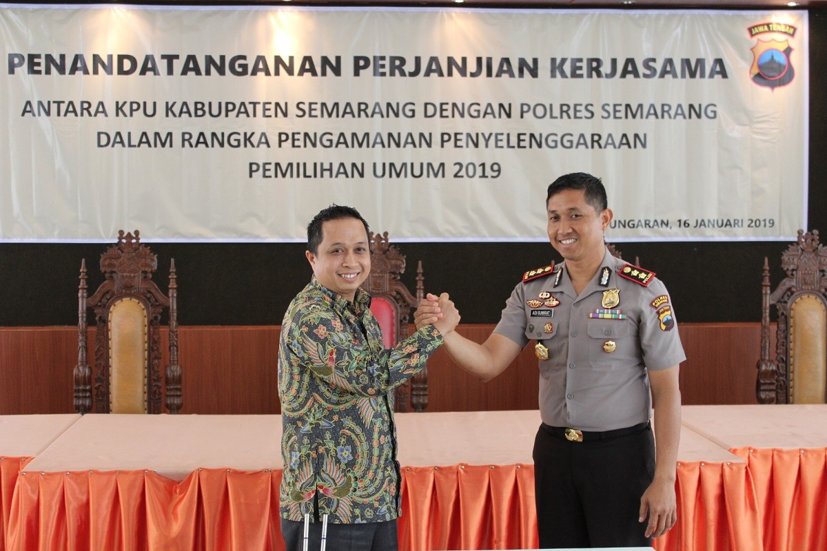 Ungaran (16/1), KPU Kabupaten Semarang bersama dengan Polres Semarang menyepakati Perjanjian Kerjasama Pengamanan Pemilu 2019. Perjanjian kerjasama ini ditandatangani secara langsung oleh Ketua KPU Kabupaten Semarang dan Kapolres Semarang di Ruang Aula Gedung Kantor KPU Kabupaten Semarang Lantai 3 pada hari Rabu, 16 Januari 2019, Pukul 14.30 WIB.