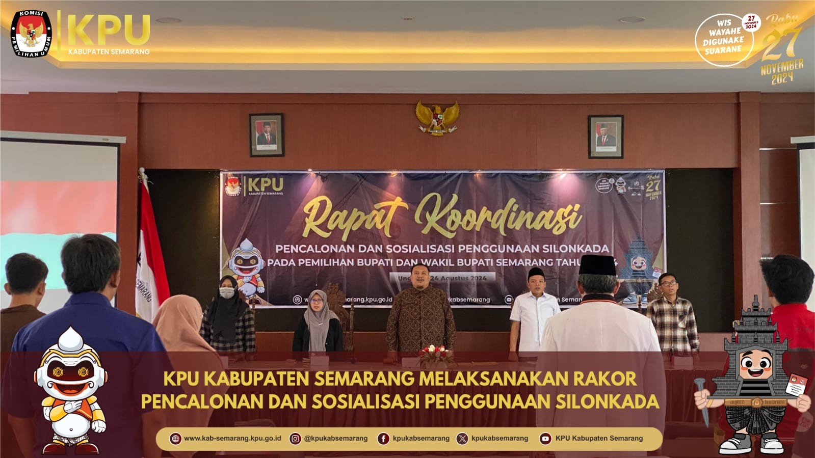 KPU Kabupaten Semarang melaksanakan Rapat Koordinasi Pencalonan dan Sosialisasi Silonkada Plibup Semarang 2024 di Aula Lantai 3 Kantor KPU Kabupaten Semarang (24/08/2024) Dalam sambutanya Ketua Divisi Sosdiklih, Parmas, SDM KPU Kabupaten Semarang Akhmad Ilman Nafia menyampaikan perkembangan pasca putusan MK nomor 60/PUU-XXII/2024 yang berimplikasi secara hukum terkait syarat syarat pencalonan Bupati dan Wakil Bupati Semarang. "Pasca Putusan MK nomor 60, secara langsung berdampak hukum pada Keputusan KPU Kabupaten Semarang terkait syarat pencalonan Pilbup Semarang 2024, alhamdulillah tadi malam KPU RI telah mengirim Surat nomor 1692 tentang Pelaksanaan Tahapan Pendaftaran Pasangan Calon Gubernur dan Wakil Gubernur, Bupati dan Wakil Bupati, serta Walikota dan Wakil Walikota, sehingga kami KPU Kabupaten Semarang mengundang bapak ibu pimpinan Partai Politik untuk bersama sama mendengarkan sosialisasi yang akan detile dipaparkan oleh Ketua divisi Teknis dan Penyelenggaraan" singkat Ilman Selanjutnya, paparan materi disampaikan oleh Ketua Divisi Teknis dan Penyelenggaraan KPU Kabupaten Semarang M.Talkhis tentang perubahan terkait pencalonan pasca putusan MK. "Ada beberapa hal yang harus kami sosialisasikan segera pasca putusan MK ini, karena jadwal pendaftaran calon tinggal beberapa hari lagi, maka untuk itu mari kita cermati satu persatu syarat calon Bupati dan Wakil Bupati Semarang khususnya terkait ambang batas dukungan calon harus memeroleh suara sah paling sedikit 7,5% dalam Pemilu anggota DPRD Kabupaten Semarang yaitu sebanyak 50.959 suara dan syarat umur untuk Bupati dan Wakil Bupati Semarang adalah 25 sejak ditetapkan sebagai calon" papar Talkhis Setelah paparan materi dan sosialisasi, dilanjutkan dengan sosialisasi Silonkada (Sistem Informasi Pencalonan Kepala Daerah) yang akan digunakan dalam proses pendaftaran paslon oleh Admin Silokada Kabupaten Semarang Bondan Koentono Kegiatan ini dihadiri Bawaslu, Pimpinan Partai Politik, dan Sekretariat KPU Kabupaten Semarang.