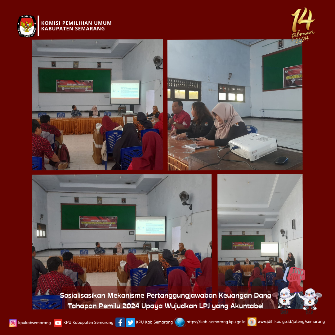 Sosialisasikan Mekanisme Pertanggungjawaban Keuangan Dana Tahapan Pemilu 2024 Upaya Wujudkan LPJ yang Akuntabel Pabelan (29/03), KPU Kabupaten Semarang hadir sebagai narasumber dalam Bimtek Penyaluran dan Pertanggungjawaban Penggunaan Dana Tahapan Pemilihan Umum Bagi Badan Adhoc di Aula Kecamatan Pabelan. Kegiatan tersebut dihadiri oleh Staf Sekretariat PPS Urusan Tata Usaha, Keuangan dan Logistik se-Kec. Pabelan dan dibuka dengan sambutan dari Camat Pabelan, Muchtarudin. Dalam sambutannya beliau berpesan agar seluruh Sekretariat PPS dapat berperan serta dalam mensukseskan Pemilu 2024 dengan menyusun LPJ tepat waktu dan menghindari LPJ fiktif. Dalam kesempatan tersebut, Kasubbag Keuangan, Umum dan Logistik KPU Kabupaten Semarang, Reyta Warastuti dan Bendahara Pengeluaran, Paulina Erna Yuliasari yang hadir sebagai narasumber memaparkan Keputusan KPU No. 53 Tahun 2023 Tentang Petunjuk Teknis Penyaluran Dana Tahapan Pemilihan Umum Bagi Badan Adhoc Penyelenggara Pemilihan Umum di Lingkungan Komisi Pemilihan Umum yang berisi tentang Mekanisme Penyaluran dan Pertanggungjawaban Penggunaan Dana Tahapan Pemilu Bagi Badan Adhoc, Dasar Pengenaan Pajak serta Format Dokumen Penyaluran dan Pertanggungjawaban Dana Tahapan Pemilu 2024. Bimtek Keuangan di Kecamatan Pabelan tersebut merupakan akhir dari Rangkaian Bimtek sebelumnya yakni Kecamatan Sumowono, Kecamatan Bandungan, Kecamatan Ungaran Barat, Kecamatan Jambu, Kecamatan Bancak, Kecamatan Banyubiru, Kecamatan Ambarawa, Kecamatan Susukan yang telah terlaksana pada 18 sd 29 Maret 2023.