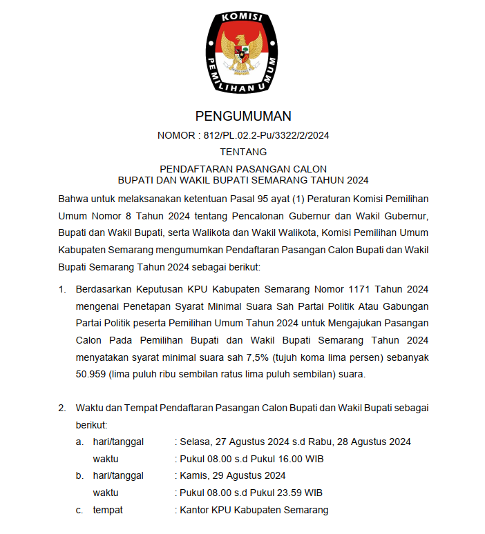 Keputusan KPU Kabupaten Semarang Nomor 1166 Tahun 2024. KLIK DI SINI