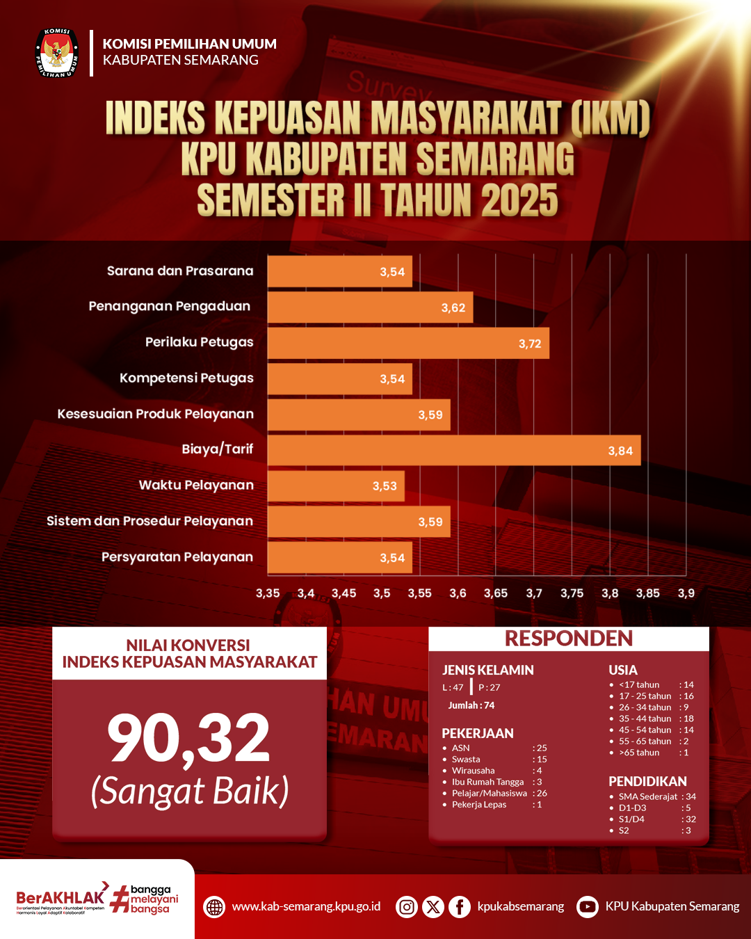 Dalam rangka mewujudkan pemerintahan yang bersih dan akuntabel serta memberikan pelayanan publik yang prima dalam pelaksanaan Tahapan Pemilu dan Pemilihan Serentak dan dengan memedomani Peraturan Menteri Pendayagunaan Aparatur Negara dan Reformasi Birokrasi Nomor 14 Tahun 2017 tentang Pedoman Penyusunan Survei Kepuasan Masyarakat Unit Penyelenggara Pelayanan Publik, KPU Kabupaten Semarang telah melaksanakan survei persepsi terhadap layanan KPU Kabupaten Semarang pada tahun 2025 semester 1. Survei tersebut diikuti oleh 57 (lima puluh tujuh) orang responden yang terdiri dari perwakilan partai politik se-Kabupaten Semarang, Organisasi Perangkat Daerah (OPD) terkait serta masyarakat umum pengguna layanan PPID KPU Kabupaten Semarang. Berdasarkan hasil survei yang diukur berdasarkan Skala Likert (skala 1-4) diketahui bahwa nilai Indeks Kepuasan Masyarakat (IKM) atas pelayanan Sekretariat KPU Kabupaten Semarang adalah 88,89 (Sangat Baik).